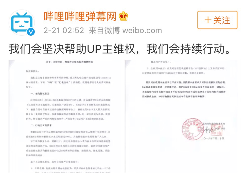 B 站 2 月 21 日清晨发布公告称,坚决协助 up 主维权,并向快视频